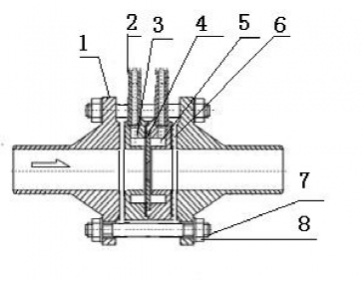 1、 法兰 2、导压管 3、前环室 4、节流件 5、后环室 6、密封垫片 7、螺栓 8、螺母